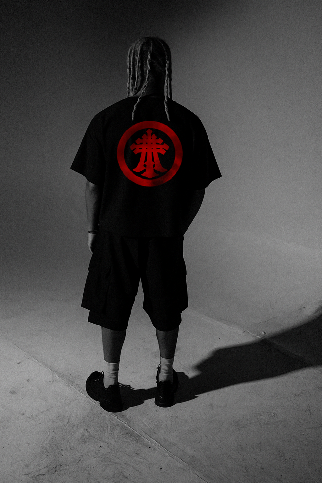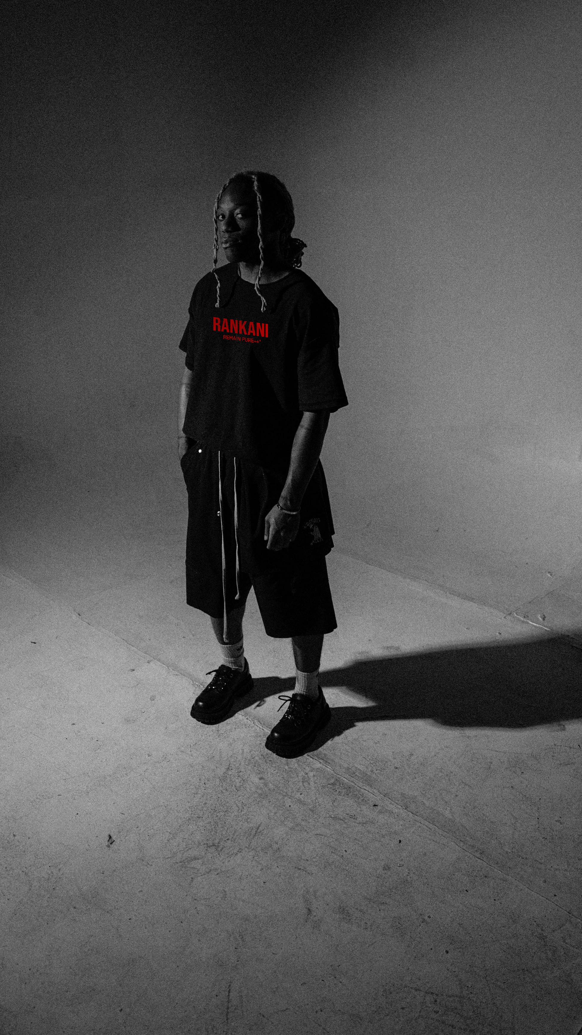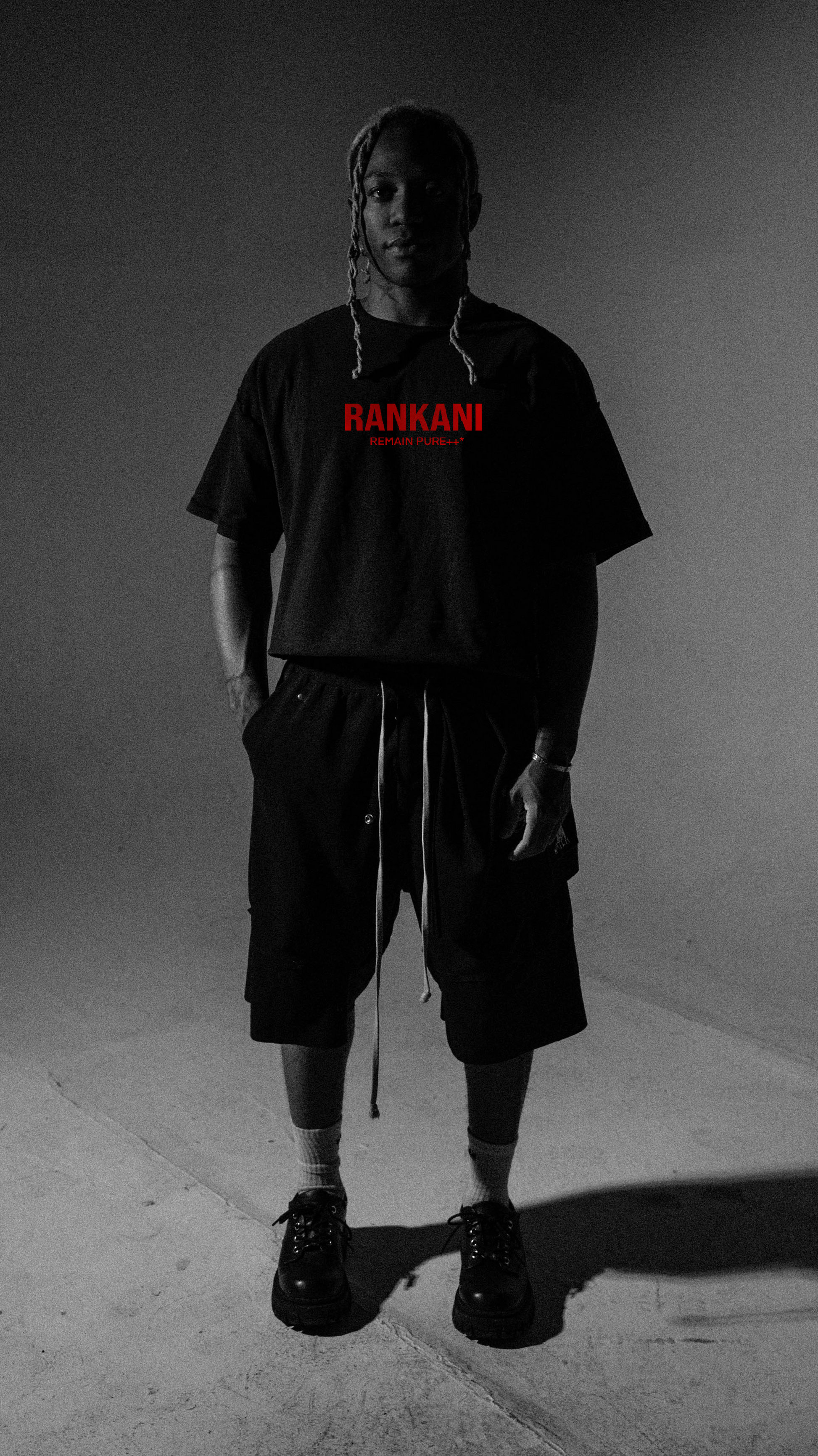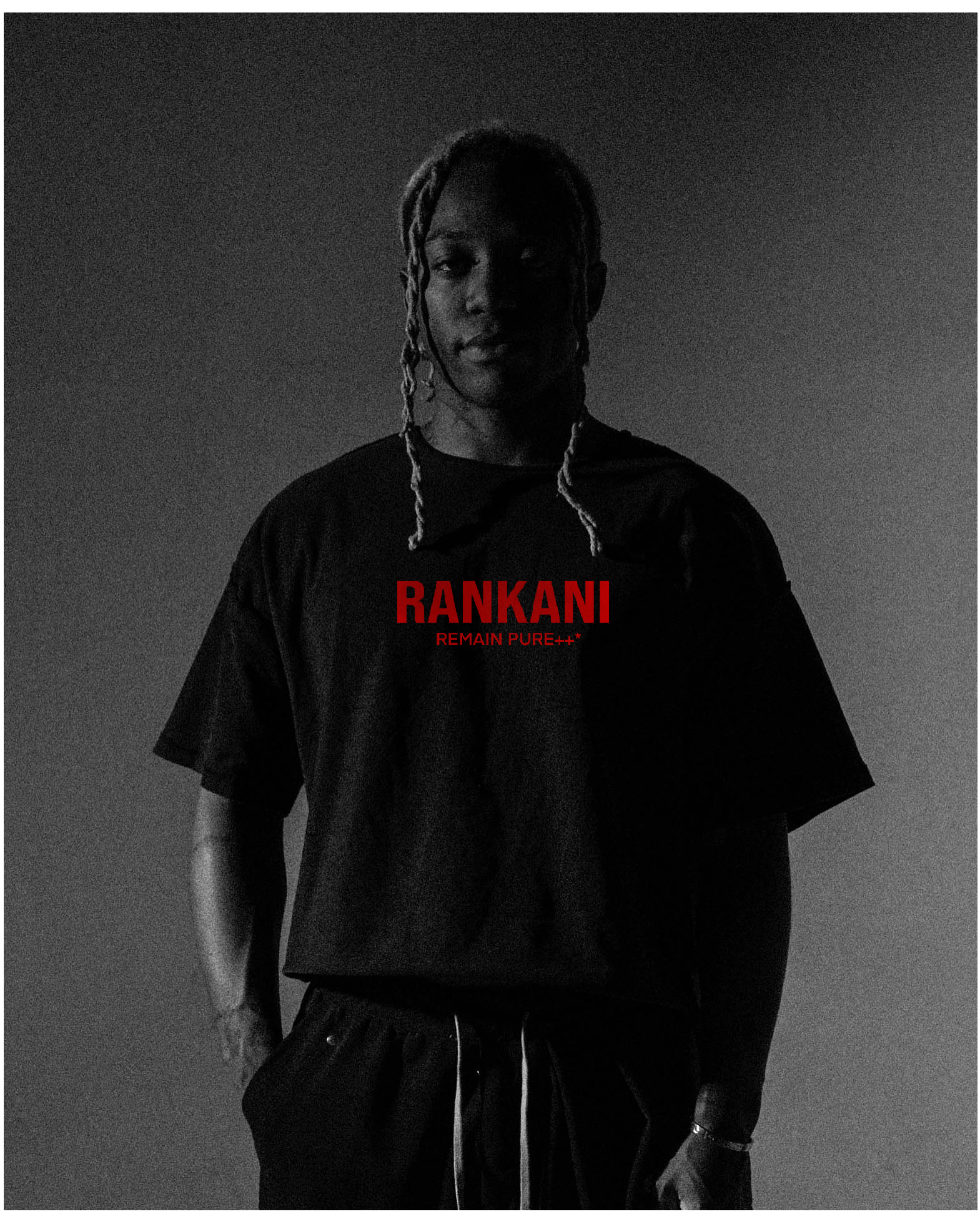 Minimal in color, maximal in statement. This black raw-edge tee features bold front branding with the REMAIN PURE++ mantra and an oversized back emblem, framed by a stark red circle. Cut for a relaxed, boxy fit with unfinished hems, it delivers that lived-in streetwear edge while keeping the focus on the graphic. Built for those who move with purpose and keep their code unbroken.